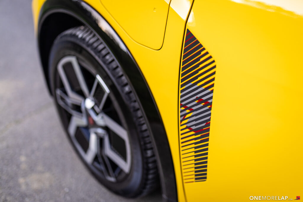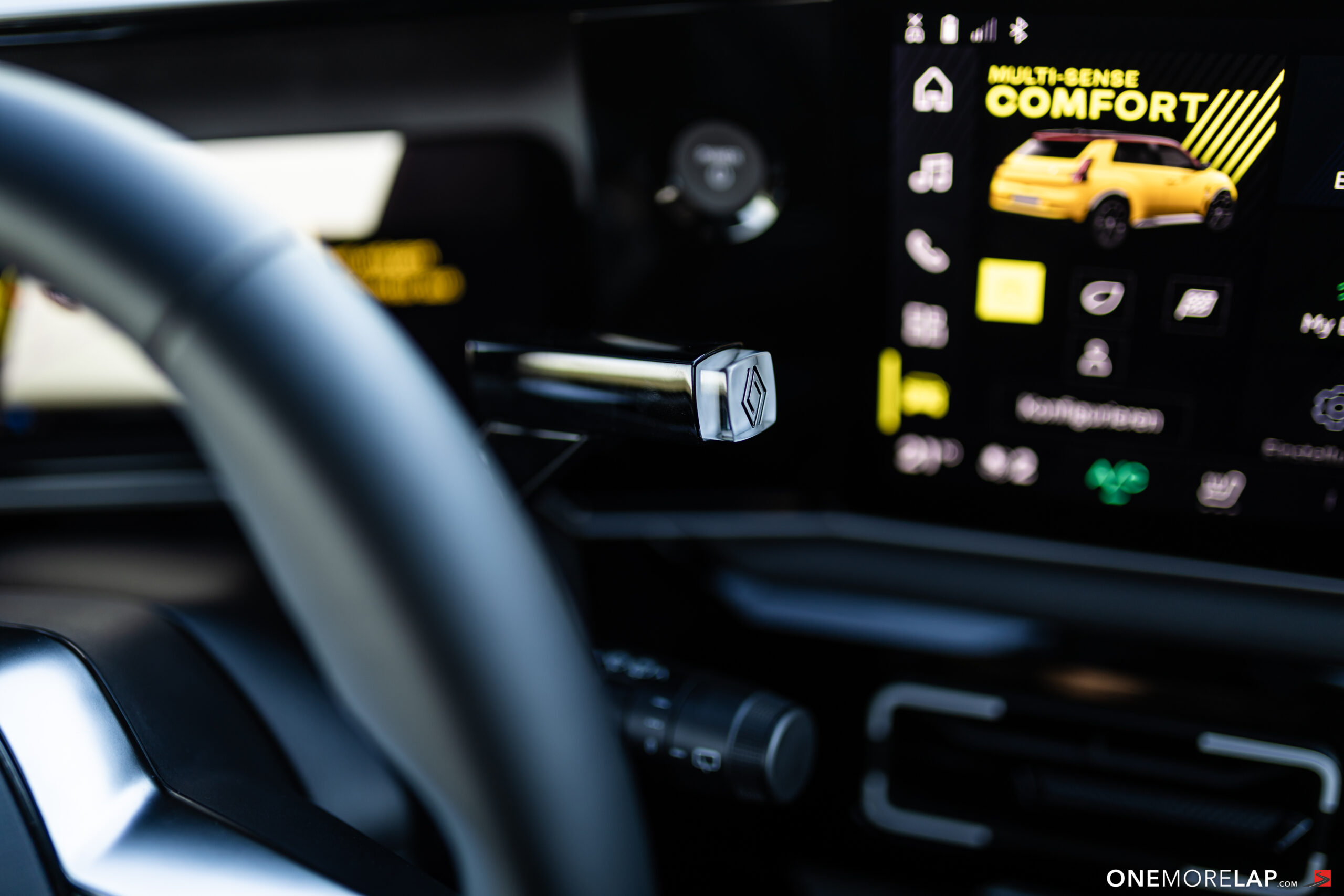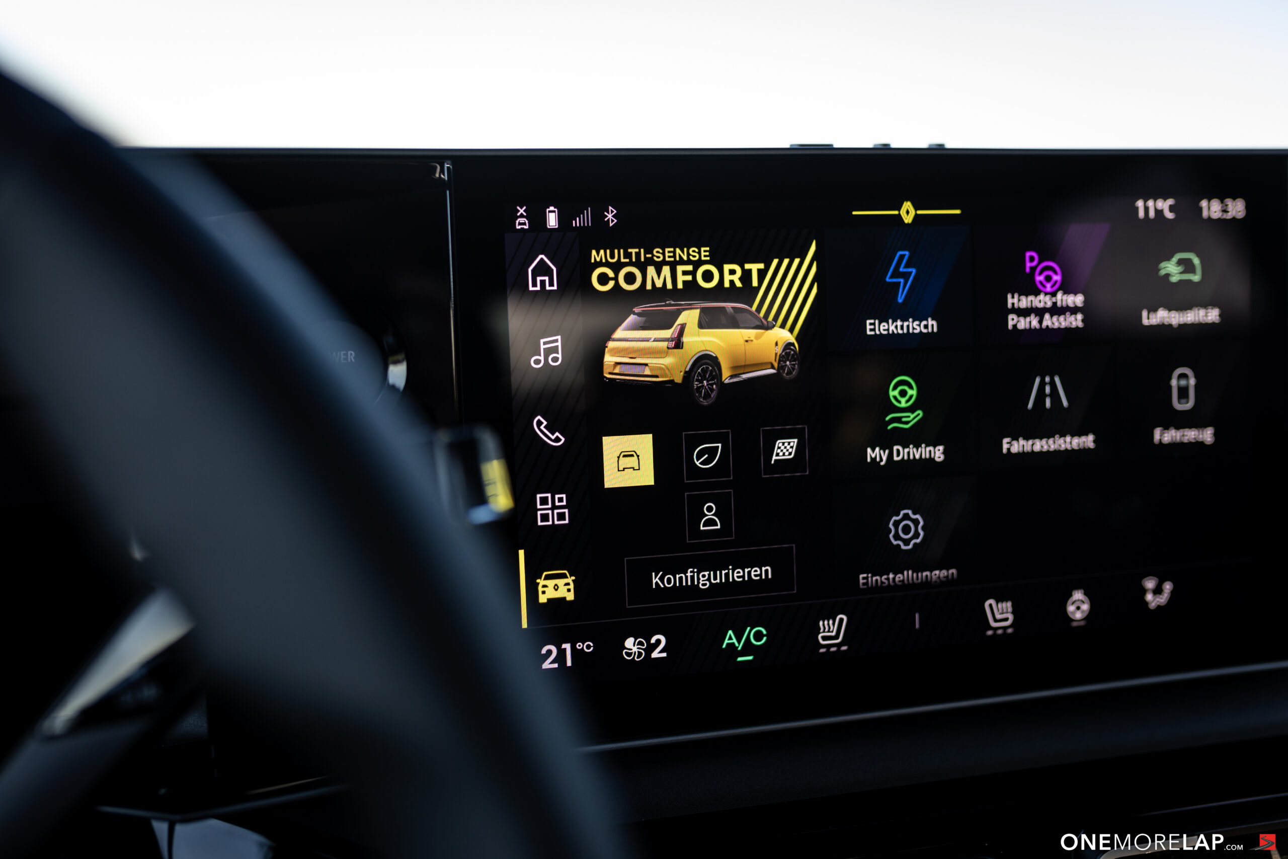 In der Mitte: Ein weiterer 10-Zoll-Screen, natürlich mit OpenR Link und eingebautem Google. Maps, Sprachsteuerung, Spotify – natürlich auch CarPlay. Vor dem Beifahrer prangt in der elegante „Renault 5“-Schriftzug, dezent hinterleuchtet. Ein bisschen Paris bei Nacht, ein bisschen OLED-Glamour aus dem Bastlerkeller der 80er. Dazu kommen Lüftungsdüsen, die nicht einfach nur Lüftungsdüsen sind. Sie imitieren die Lichtsignatur der Frontscheinwerfer auf – ein kleines, aber wirkungsvolles Detail, das zeigt: Hier hat jemand mit Liebe zum Produkt gearbeitet. Und das merkt man auch beim Rest.