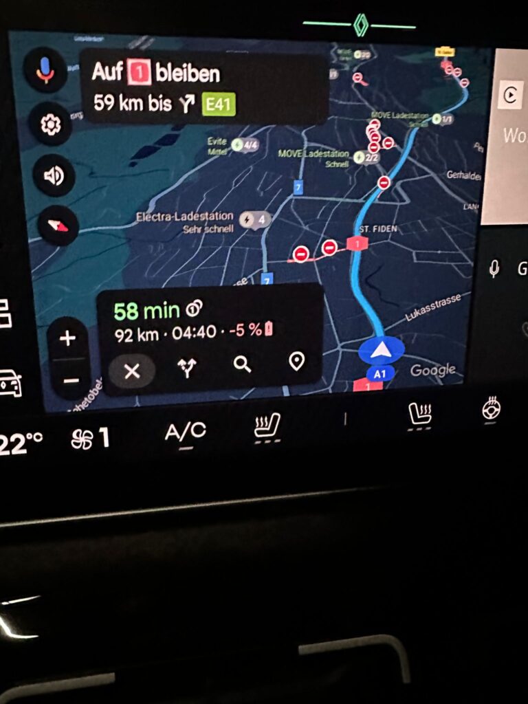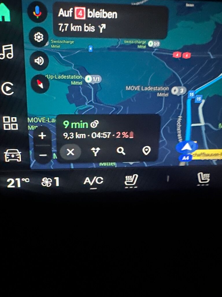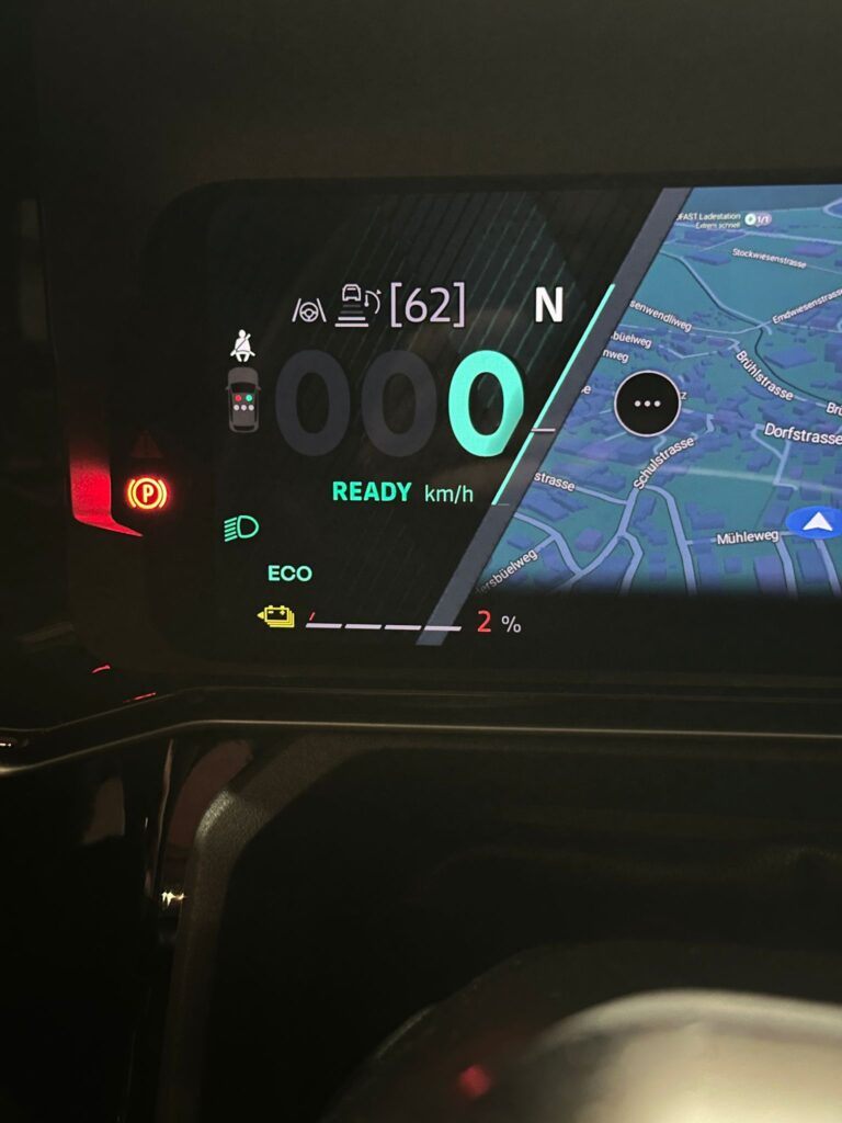Die Ladeplanung über Google Maps funktioniert dabei zuverlässig und ist ein echter Vorteil gegenüber Systemen ohne native Navigation. Kein veralteten nativen Herstellerkarten, keine Drittanbieter-Apps – einfach Ziel eingeben und laden lassen. Wer ein bisschen vorausschauend fährt, hat keinen Stress. Nur sollte man eben nicht mit 2 % quer durch die Ostschweiz gondeln – das war dann doch etwas mutig.